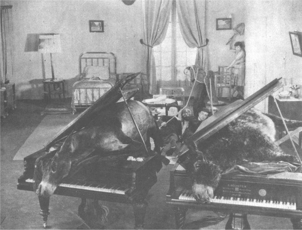 Záběr z filmu Andaluský pes, na kterém táhne jedna z postav piána s duchovními a mrtvými osly.