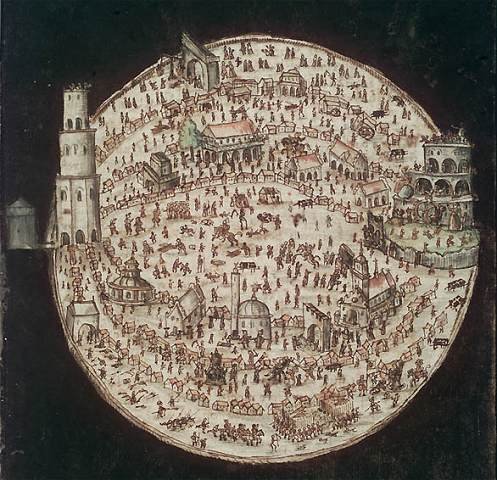 Takto nakreslil labyrint světa sám Jan Amos Komenský. Najdi na obrázku města Bránu života, Bránu rozchodu, ulice šesti stavů, hrad Štěstí, náměstí a sídlo Moudrosti.
