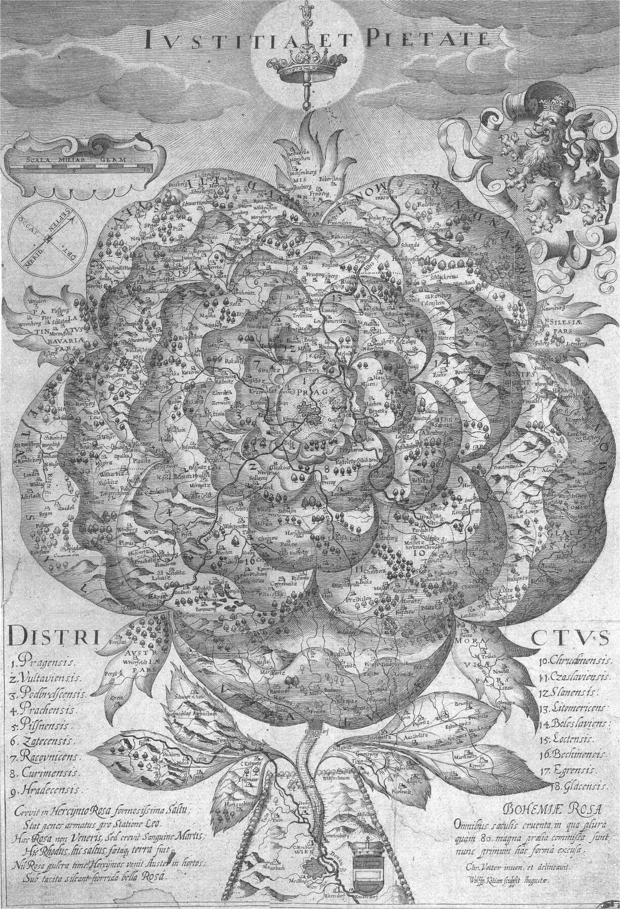 Alegorická mapa Čech v podobě růže se nachází v Balbínových Rozmanitostech z historie království českého. Rytinu vytvořil Kristián Vetter podle obrazu Pavla Aretina z Ehrenfeldu.