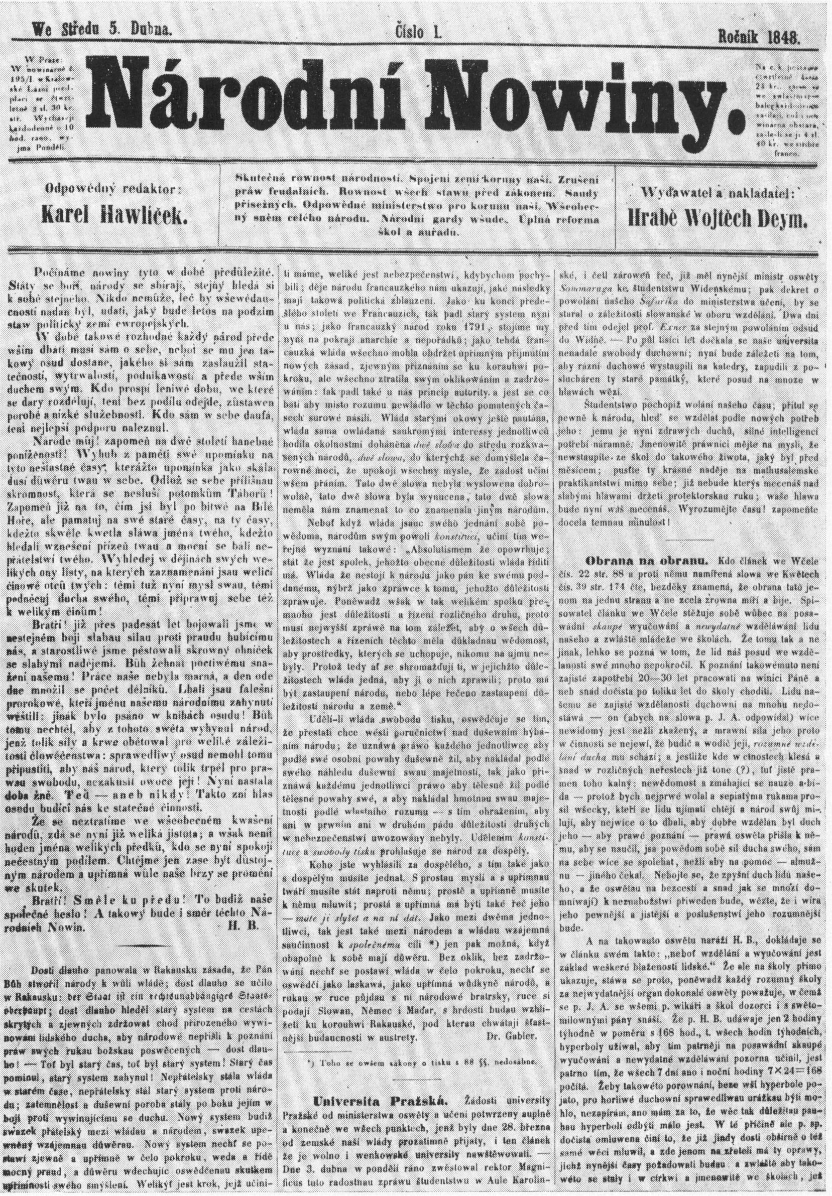 Aktivně se zapojil do revolučního dění v roce 1848. Stal se členem Svatováclavského výboru, založil Národní noviny (1848-1850) se satirickou přílohou Šotek, účastnil se Slovanského sjezdu a byl zvolen do říšského sněmu. Přestože odsuzoval radikály a hlásil se spíše k umírněnému křídlu liberálů a demokratů, byl několik dní vězněn. Opakovaně se pro své názory ocitl před soudem, ale vždy byl osvobozen. Po zákazu Národních novin začal vydávat v Kutné Hoře politický časopis Slovan (1850-1851). Roku 1851 byl Havlíček zatčen a deportován do Brixenu. Do Čech se mohl vrátit až po čtyřech letech, ale už v roce 1856 umírá na tuberkulózu.