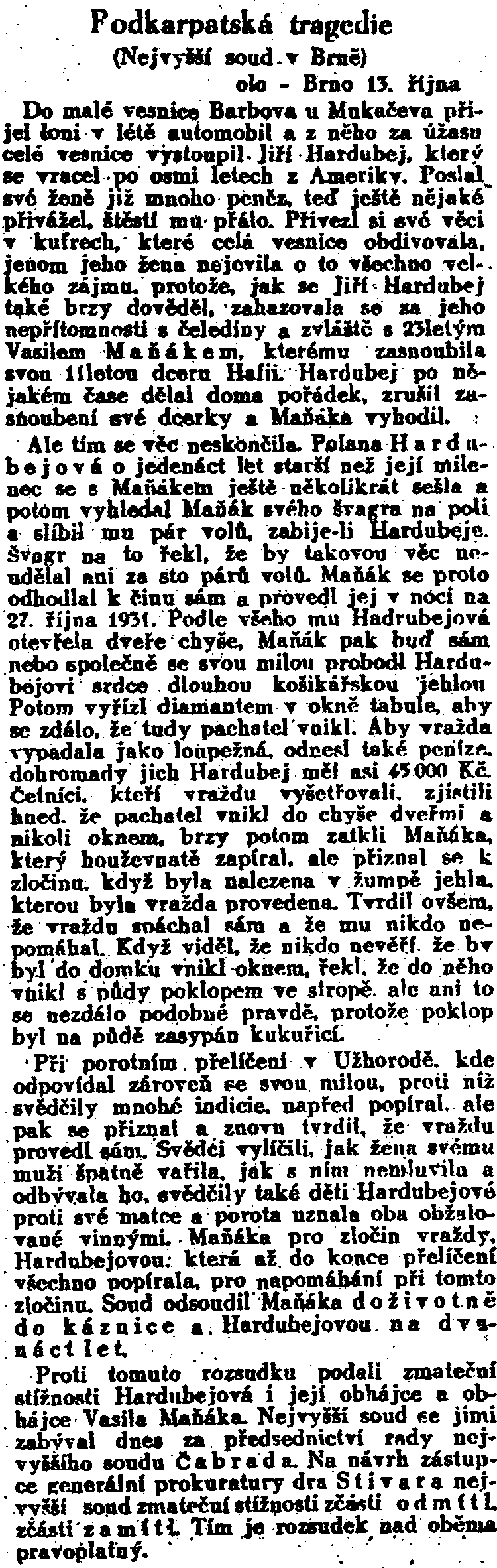 Román Hordubal se odehrává na Podkarpatské Rusi. Titulní hrdina Juraj Hordubal odjel za prací do Ameriky. Po osmi letech se vrací na svůj statek k manželce Polaně a dcerce Hafii. Rodina ale už žije jiným životem. O Hordubalovo hospodářství pečuje najatý čeledín Štěpán Manya, který není lhostejný ani Polaně. I Hafie ho má radši než otce. Hordubal čeledína vyžene a sám se stará o celý statek. Jednoho dne je Hordubal nalezen mrtev ve své posteli. Případ vypadá jasně – vrahem je Štěpán, se kterým čeká Polana dítě. Během vyšetřování i soudního procesu se ale objevuje stále více nesrovnalostí, například o vražedné zbrani nebo ve výpovědích svědků. Každý z účastníků vidí případ jinak. Porota nakonec odsoudí Štěpána k doživotí a Polanu ke 12 letům těžkého žaláře.