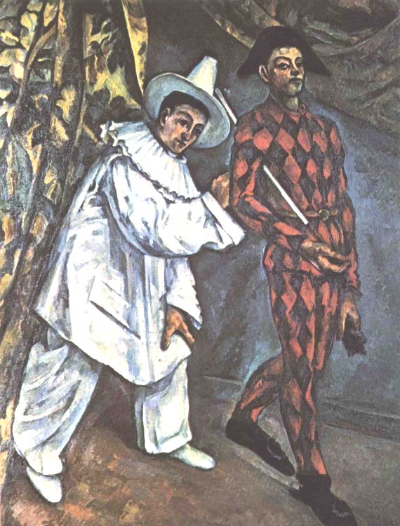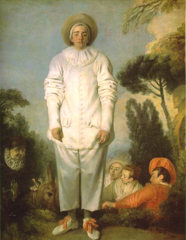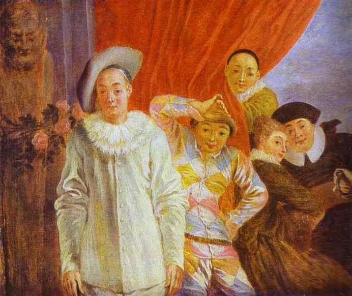 Na Watteauově obraze je zachycen pierot, harlekýn, scapino a milenecký pár.