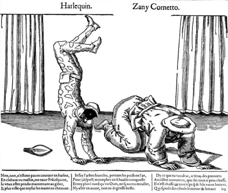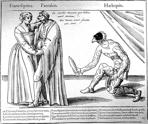 Na konci renesance vznikl v Itálii nový druh divadla – komedie dell'arte. Tato představení se velmi lišila od tradičního dramatu. Jejich jádrem byla herecká improvizace, komické výstupy (lazzi), postavy v typických kostýmech i s předem daným charakterem (masky) a stručné scénáře popisující děj hry, ve kterých chybějí dialogy. Komedie dell'arte hráli nejdříve amatéři, později profesionální soubory, pro městské i dvorské publikum. Většinou šlo o komedie s velmi drsným humorem. Toto divadlo si oblíbili nejen diváci v Itálii, ale také v Paříži. Komedie dell'arte se bez výrazných proměn provozovala i v době baroka (stručné scénáře nebylo snadné cenzurovat) a klasicismu. Čerpal z ní Molière [moljér] (1622-1673), který s komedií dell'arte musel soutěžit o zájem diváků a věnoval se jí i Carlo Goldoni (1707-1793). V 18. století komedie dell'arte jako celek zaniká, ale některé masky přetrvávají v baletu a pantomimě, které byly vedle zpěvu její nedílnou součástí. Jsou to především postavy kolombíny, harlekýna a pierota. Nejznámějším představitelem pierota byl mim českého původu Jean-Baptiste Gaspard Deburau [žan batist gaspár debiro] (1796-1846). Někteří herci přešli k cirkusům, kde vystupovali jako artisti nebo klauni. Postavy z komedie dell'arte využívá také loutkové divadlo.