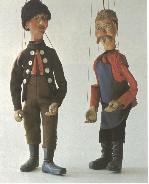 Loutky sedláka Škrholy a Hospodského od Josefa Róna z Vysokého nad Jizerou