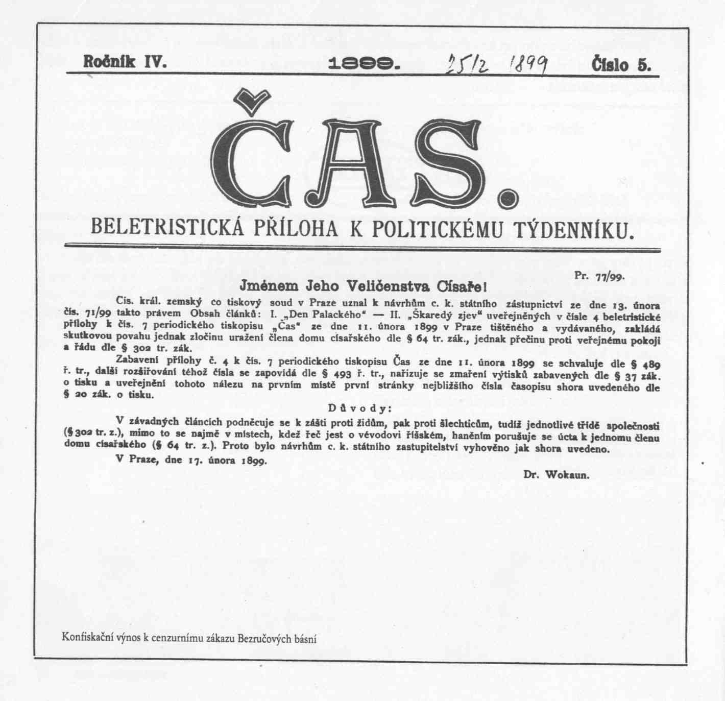 Konfiskační výnos k cenzurnímu zákazu Bezručových básní Škaredý zjev a Den Palackého