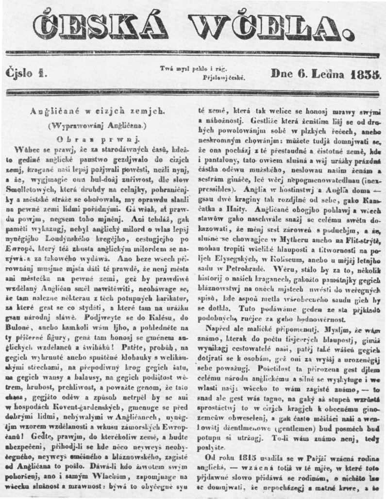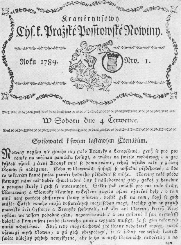 První české noviny vydával Karel František Rosenmüller. Nesly název Český Postilión neboli Novíny české (1719-1772). Václav Matěj Kramerius (1753-1808) vydávání českých novin obnovil. Krameriusovy c.k. pražské poštovské noviny (1789-1825), původní název Schönfeldské c.k. Pražské noviny, později Krameriusovy c.k. vlastenecké noviny, měly literární přílohu Pražský posel. Kramerius byl rovněž majitelem knihkupectví a nakladatelství Česká expedice, významného centra obrozenecké kultury. Důležitou roli hrála literární příloha Pražských novin Česká včela (1834-1850) a beletristické časopisy jako Hlasatel český, Prvotiny pěkných umění, Rozmanitosti, Jindy a nyní, Květy, později Květy české (1834-1850), Čechoslav a Dobroslav. V jejich redakcích působil Čelakovský, Tyl nebo Karel Havlíček Borovský.