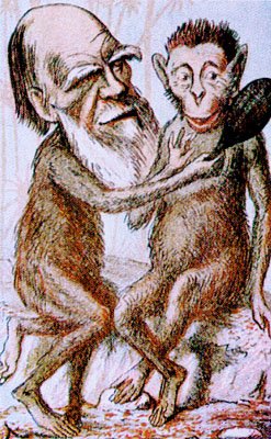 Darwin (vlevo) na dobové karikatuře