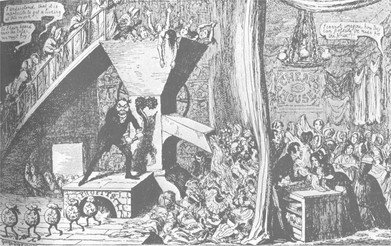 George Cruikshank: Chudé pracující dívky se snaží vydělat si na živobytí výrobou nějakých elegantních tretek na prodej (karikatura)