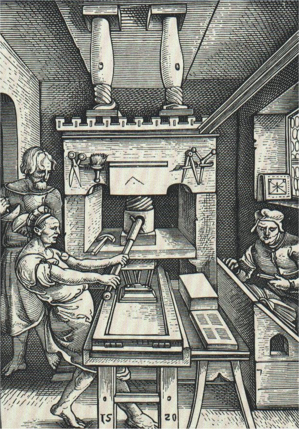 Knihtisk umožnil do té doby nevídané rozšíření literárních děl. Vynalezl ho německý zlatník Johannes Gutenberg (1400-1468), který působil v Mohuči a Štrasburku. Samozřejmě nevěděl, že podobným způsobem šířili své texty Číňané už v 9. stol. Gutenberg začal jako první odlévat jednotlivá písmena do matric. Skládal z nich stránky, které se daly opakovaně potřít černou barvou a otisknout na papír. K tomu se používal upravený vinařský lis. Obrazovou přílohu tvořily dřevoryty a jednotlivé stránky se před svázáním knihy ručně kolorovaly.