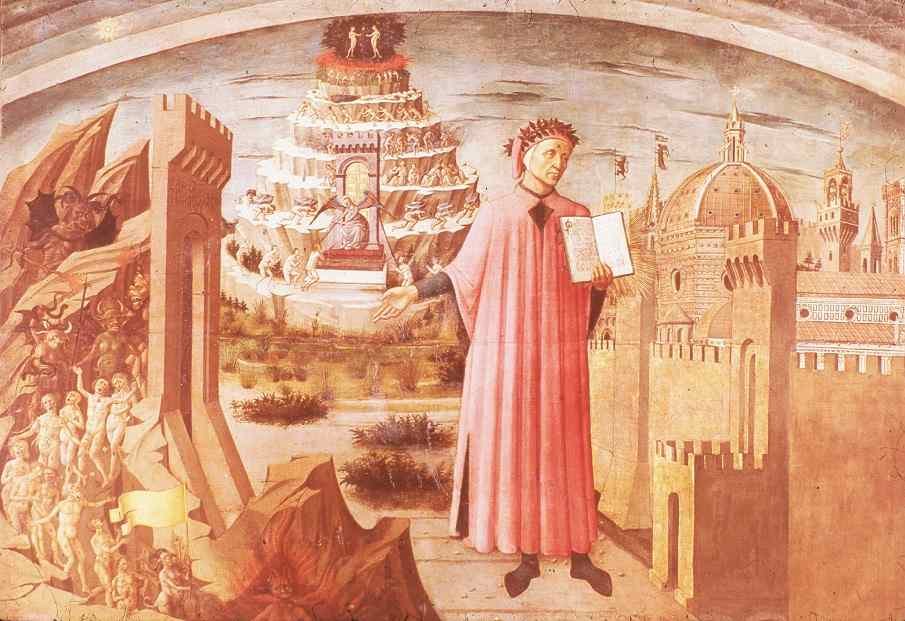 Dantova básnická skladba Božská komedie se skládá ze tří částí – Peklo, Očistec a Ráj. Z jejich názvů je zřejmé, že autor zůstává věrný křesťanským ideálům, ale v textu je už patrný jeho obdiv k antice. Středověký žánr alegorie zase doplňují antické prvky. To všechno dělá z Danta předchůdce renesančního umění. Celá skladba má 100 zpěvů.