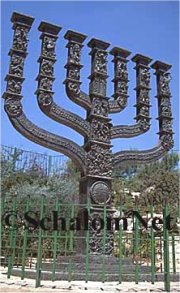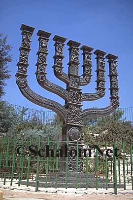 Obrovský sedmiramenný židovský svícen (menora) stojí před jeruzalémským parlamentem.