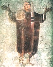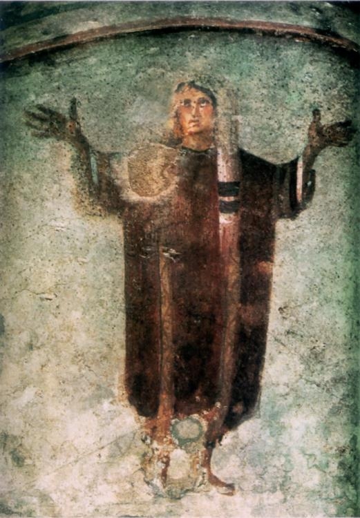 V římských katakombách se zachovaly nástěnné malby s vyobrazením věřících vzývajících Boha se zdviženýma rukama (oranti).
