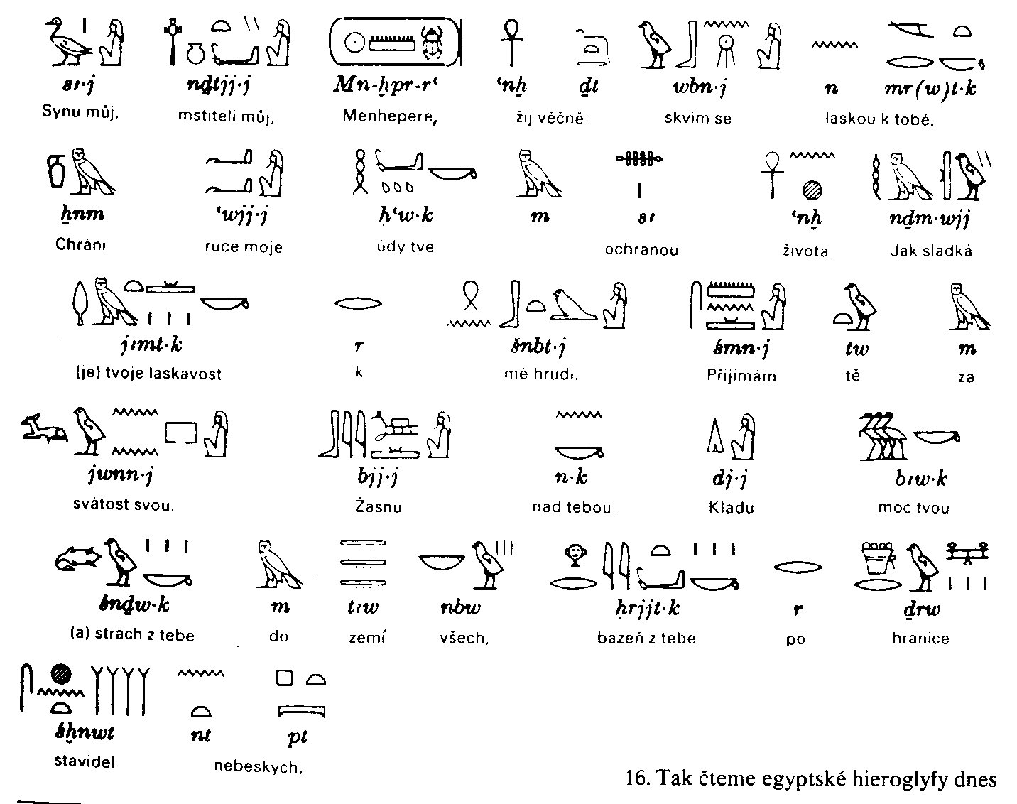 Ukázka hieroglyfického nápisu s fonetickým přepisem a překladem.