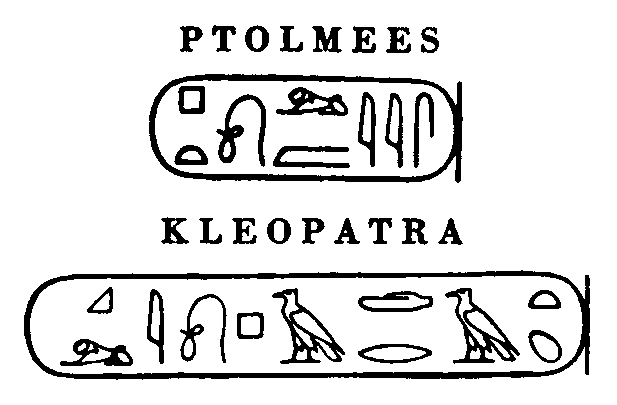 Champollion přišel na to, že kartuše (ovály) označují jména panovníků. Hieroglyfy v nich tedy nezastupují celá slova, ale pouze jednotlivé hlásky. Jako první rozluštil jména faraonů Ptolemaia a Kleopatry.