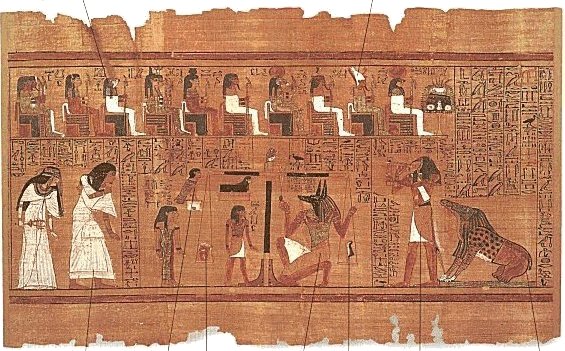 Během vlády XXVI. dynastie (663-525 př.n.l.) se ustálila závazná podoba tzv. Knihy mrtvých (Kniha o zjevování se na světle denním). Šlo vlastně o rozsáhlou sbírku starších zaříkadel a rad známých už z textů pyramid a rakví. Kniha mrtvých se přikládala k mumii nebo se vkládala do zvláštní schránky, byla zapsána na papyrovém svitku a obvykle bývala bohatě ilustrována. Duše zemřelého zde vystupuje jako srdce N-ovo nebo N. Mrtvý musel projít mnoha nástrahami a použít různá zaříkadla (na oživení vešebtů, aby měl vodu a vzduch, aby se mu otevřely správné dveře atd.). Nakonec dorazil do síně obou pravd, kde bůh podsvětí Usirev (Osiris) položil na jednu misku vah jeho srdce a na druhou peříčko. Pokud bylo srdce lehčí (nezatížené hříchy), byl mrtvý prohlášen za spravedlivého a mohl zamířit do obdoby křesťanského ráje. V opačném případě skončil v jakémsi pekle, kde musel jíst výkaly a pít moč… |