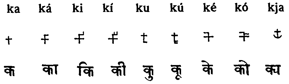 Ukázka indického systému slabik. V prvním řádku je výslovnost, ve druhém zápis v písmu brahmí a na posledním je písmo dévanágarí.