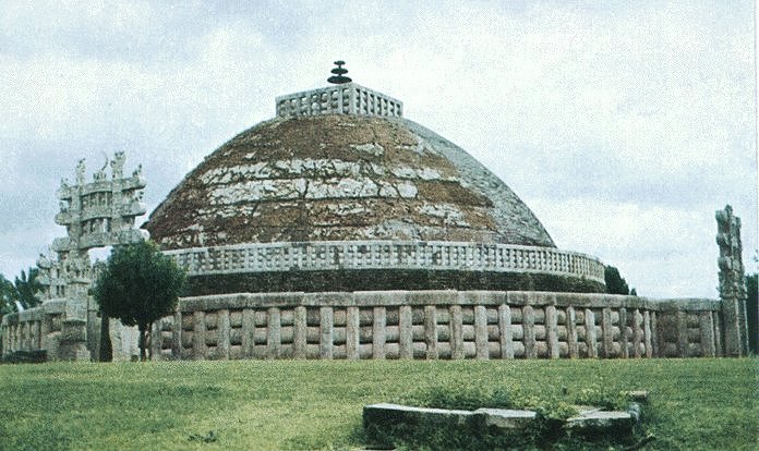 Buddhistická stúpa v Sánčí. Stúpy jsou vlastně schránky na Buddhovy ostatky. Mají podobu převrácené misky.