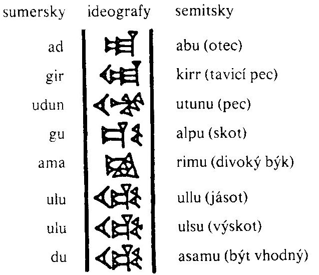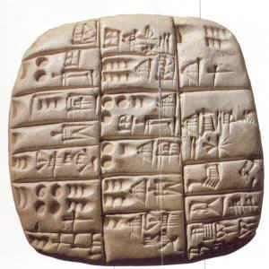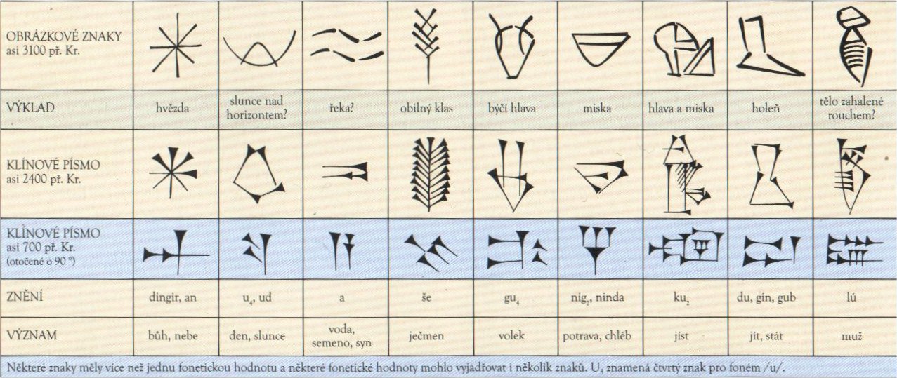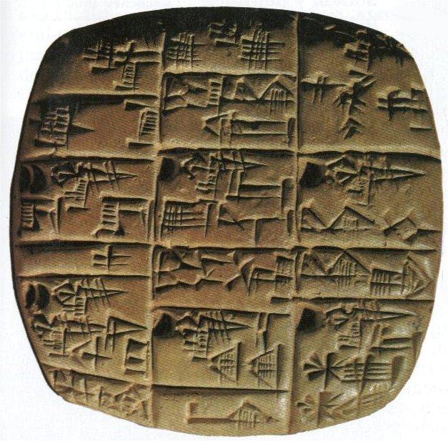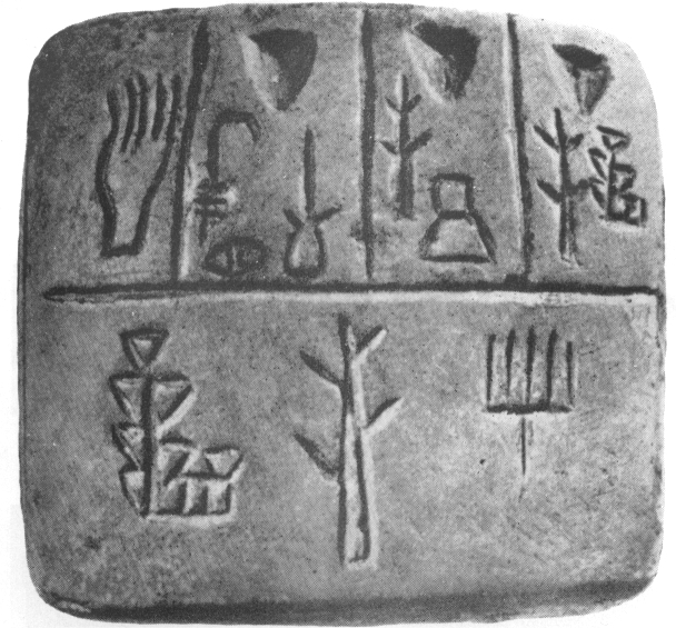 Hliněná destička s nejstarším sumerským obrázkovým písmem (4. tis. př.n.l.). Tři znaky v dolní části představovaly slova kněz, princ a velký.