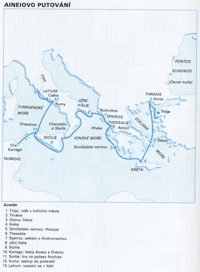 Aeneis je římskou obdobou homérských eposů. Po pádu Troje hledá poražený hrdina Aeneas novou vlast. Na své pouti zažije řadu dobrodružství, z nichž je nejdůležitější jeho sestup do podsvětí, kde se dozví o budoucí slávě Říma. Jeho putování je plné nástrah bohyně Junony, ale Aeneas nakonec šťastně přistane nedaleko ústí řeky Tiber. Po vítězství nad králem Turnem získává ruku Lavinie, dcery krále Latina, naplňuje svůj Osud a stává se praotcem Římanů.