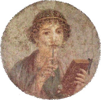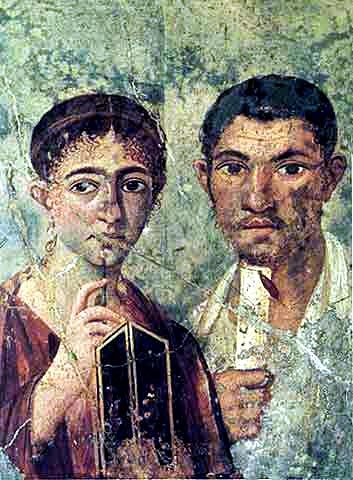 Nástěnná malba z Pompejí Terentius a jeho manželka zachycuje ženu, která píše na navoskovanou destičku.