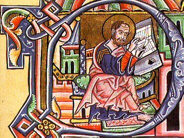 V iniciále (velmi zdobené počáteční písmeno textu) je zachycen mnich, který si ořezává husí brk na psaní.